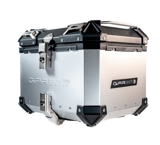 Capacity: 45 L GPR TECH TOP CASE ALPI-TECH, capacity 45 Liters, 5052 aluminum made,with reinforced corners, Silver color with specific plate an hardware included to can mount the product on original rear rack without any modification. This Top Case allow to place an Enduro helmet. The GPR TECH top case includes a washable and removable lining for helmet protection. The backrest protection amd the removable object bag be purchased separately. Aluminum Top Case in Silver with Specific Plate Included FEATURES: ● It mounts without modifications on original rear rack ● The internal fabric protection for helmet and document holder is included in the kit ● It can contain an Enduro helmet ● The product is waterproof, the internal lining is washable ● Aluminum made with anodized handles and guards ● Installation is possible thanks to the specific plate and GPR TECH adapters, however if you install the product on a non-original luggage rack or without GPR TECH adapters, you must check that the plate has at least 4 fixing points, without this minimum GPR TECH will not assumes no responsibility for the instability and therefore potential danger of use. ● Made in Italy, 2 year of international warranty. SPECFICATIONS: Internal Dimensions (W x L x H): 49 x 38 x 36 cm. / 19.29 x 14.96 x 14.17 in. Maximum Carrying Weight: 9 Kg. / 19.8 Lbs. External Color: Silver Internal Color: Black Reference: S.6.BA.45.ALP.A
