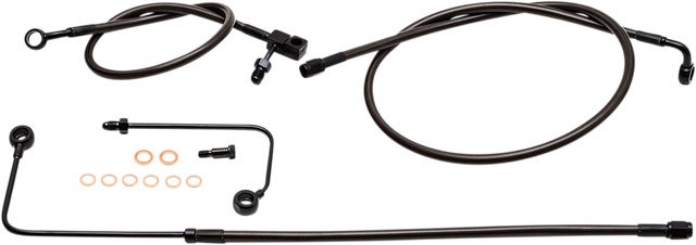 - Lines appear graphite or carbon fiber in appearance, providing that ultra custom look and the black fittings seamlessly blend with blacked out controls and covers on the bike