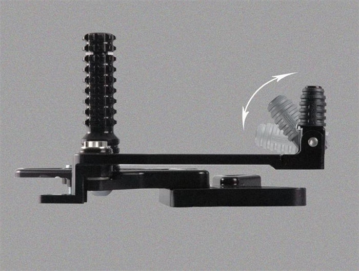 - Patented folding toe peg protects pedals from crash damage while offering .5 inch of pedal length adjustment.