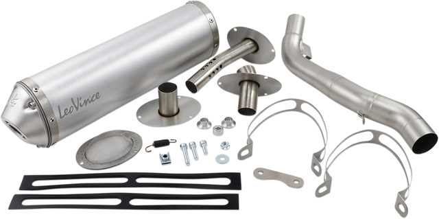 Silencer has a semi-direct internal structure and is fastened to the frame by carbon clamps The format of the silencer is tailored according to the specific engine model in order to boost the torque and the maximum power rating Laser etched LeoVince logo Includes a spark arrestor that meets U.S.F.S. homologation requirements from the United States Department of Agriculture – Forest Service